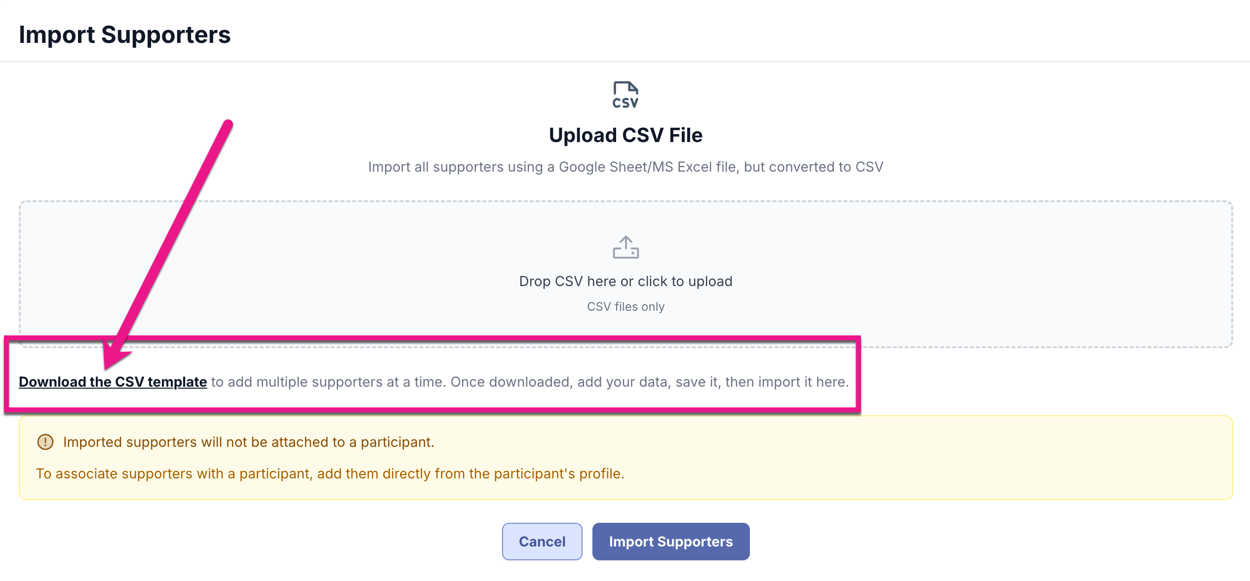 - On the Import Supports Page, click on the link that says "Download the CSV template" to download the necessary template for adding your list of Supporters.