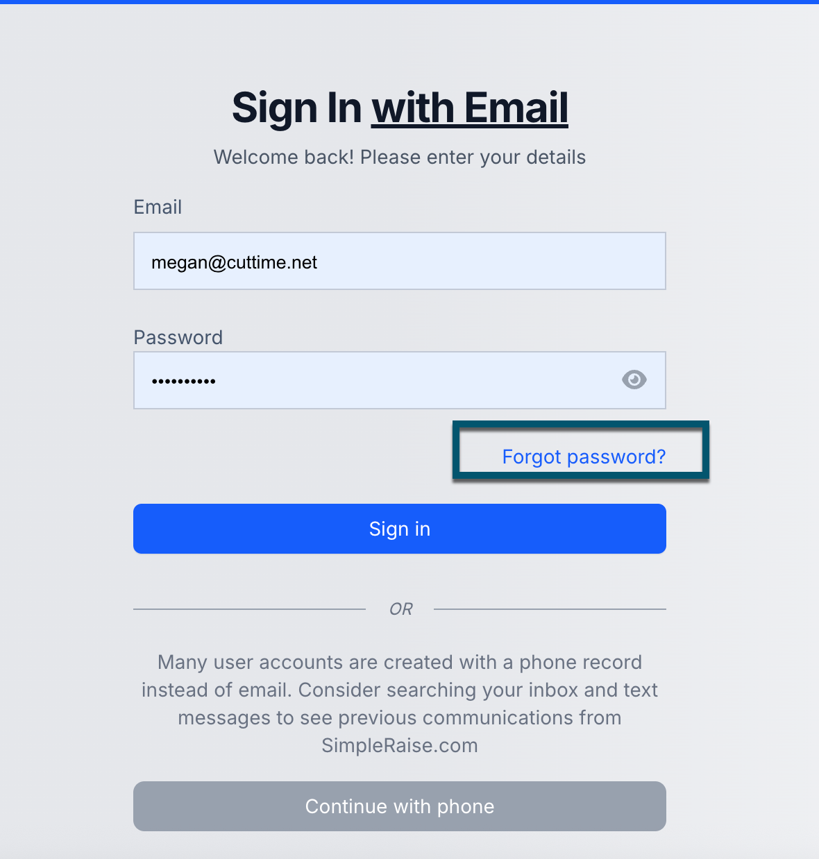 - Enter the email address associated with your Simple Raise account and click "Reset Password":