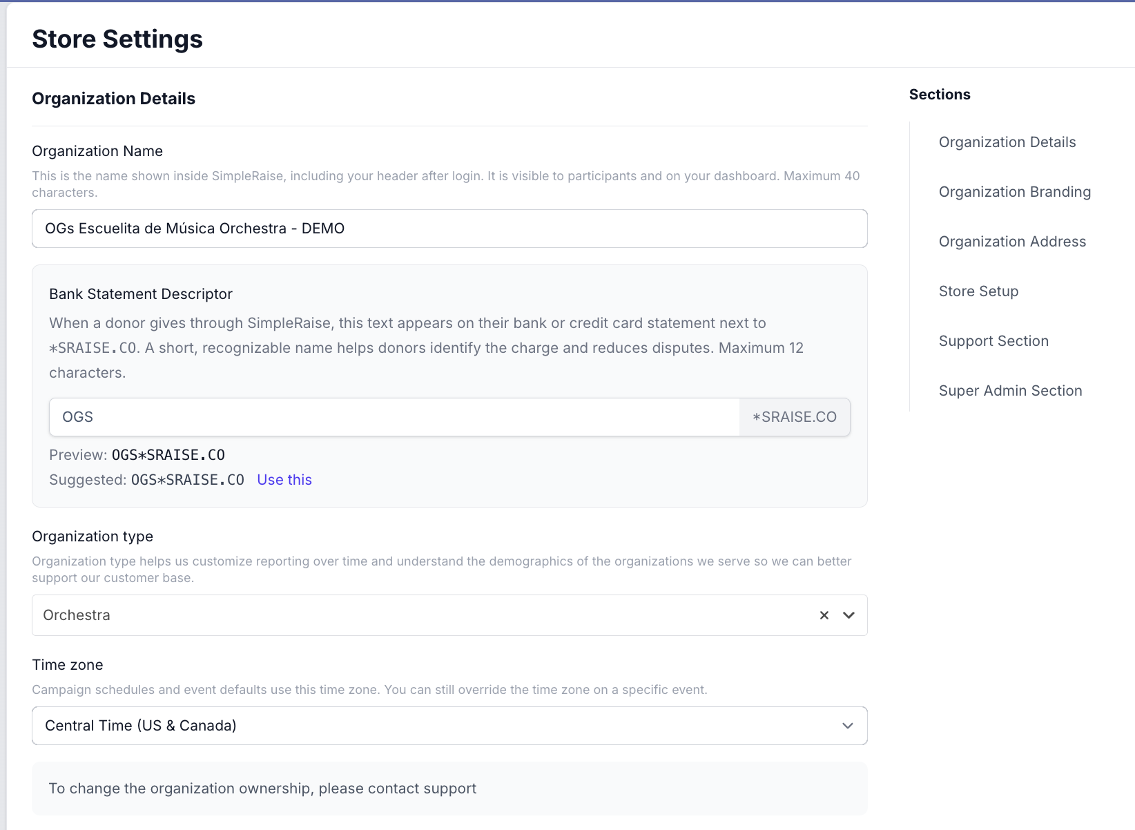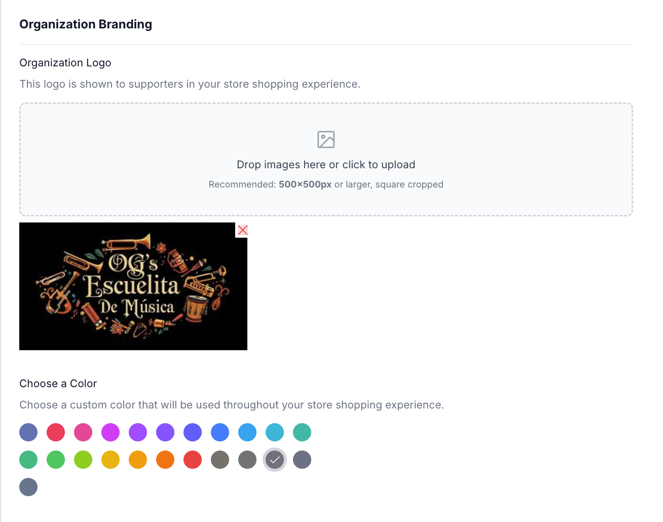 If you are the designated Organization Administrator for your program, you will need to finish setting up your Organization’s Profile once you have successfully authenticated your account credentials. You can do this either by clicking on the link contained in the notification email you will receive from Simple Raise OR if you are still logged in, go to the Store Settings Page on your Dashboard.