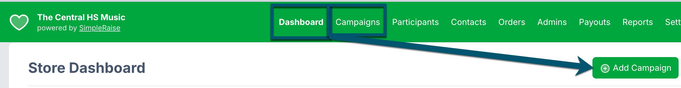 To create a new fundraiser in Simple Raise, select "Add Campaign" from the Campaigns Page or on the main Store Dashboard Page. This action will trigger the create campaign workflow.