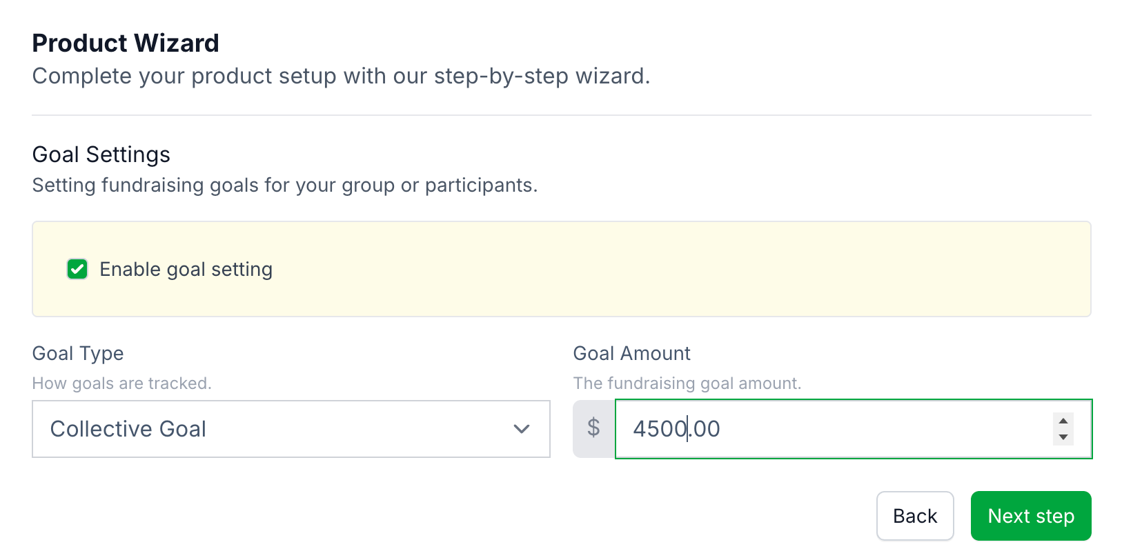 Enter your fundraiser name and description, choose to enable goal settings and the goal type, as well as the goal amount.