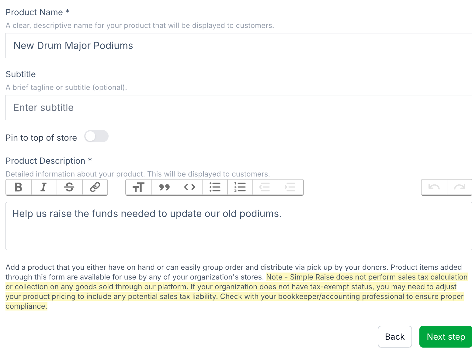 - Product Categories: select the category this Fundraiser Campaign falls under. For example, you could have categories in your store like "Fundraiser", "Merch/Swag", and "Tickets", and label any basic fundraisers under that Fundraiser category in the store.