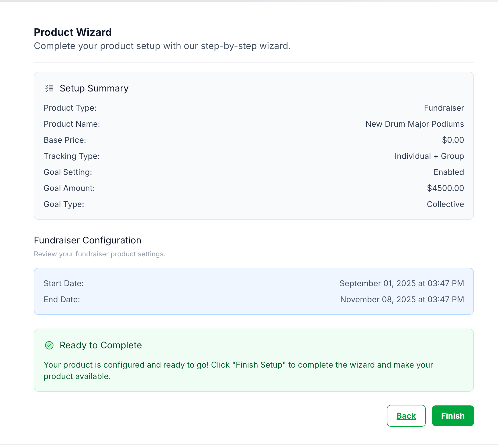 Complete your setup: Check over your details then click "Finish" to publish this Fundraiser.
