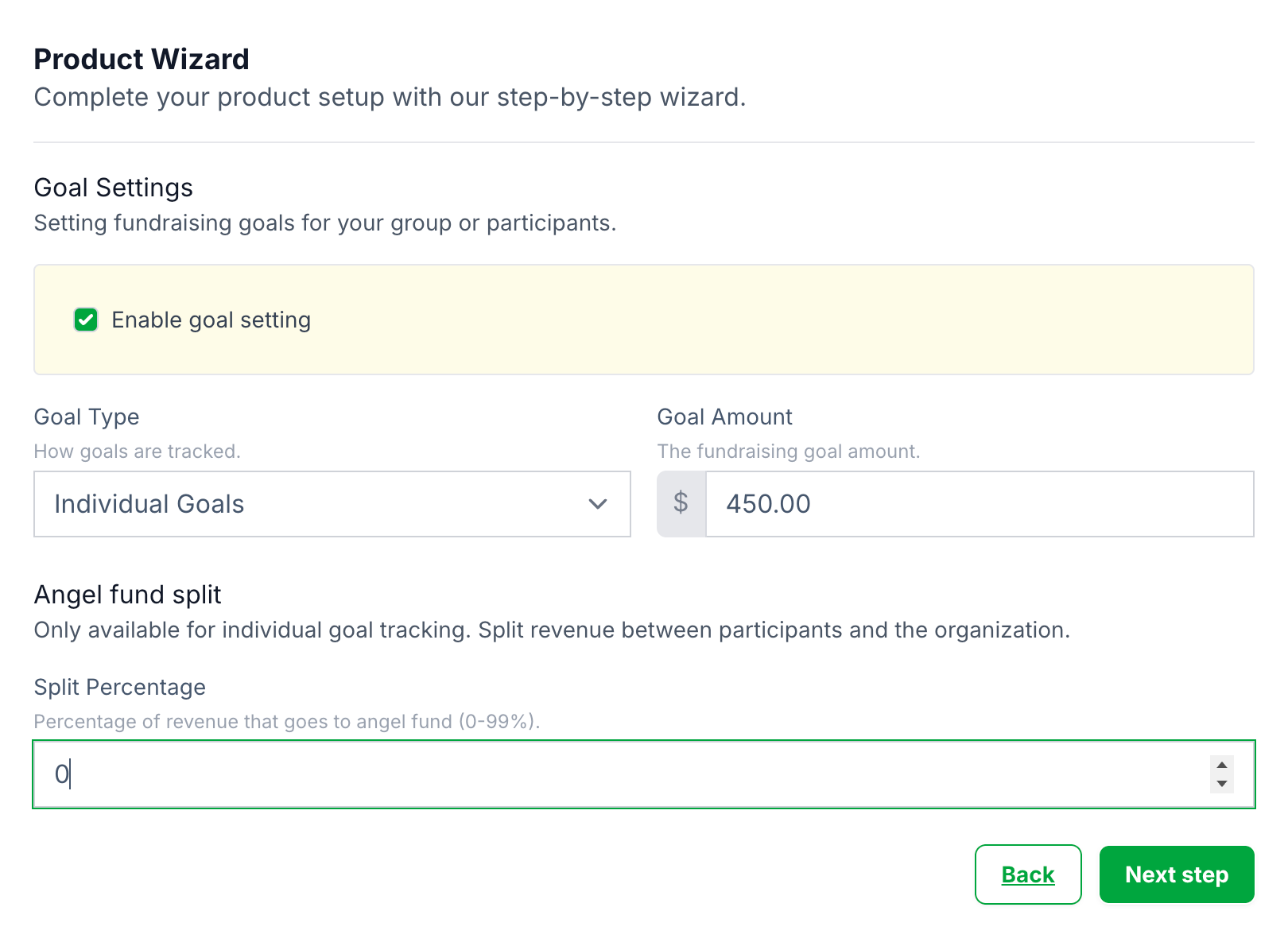 You set a specific financial goal for EACH of your fundraising participants. If you use this option, you can also split the goal between the individual Participant, and the Angel Fund (the organization's funding).