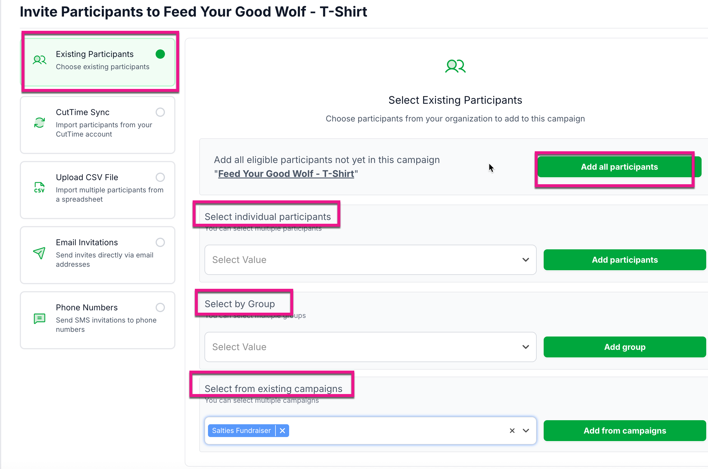 If you have added Participants to another campaign before, they will already be in your SimpleRaise account. On the Existing Participants section you can type a specific name under "Select Individual Participants", or use the Group or Existing Campaigns option to choose from. You can also select the "Add All Participants" option to add all participants from across your account.