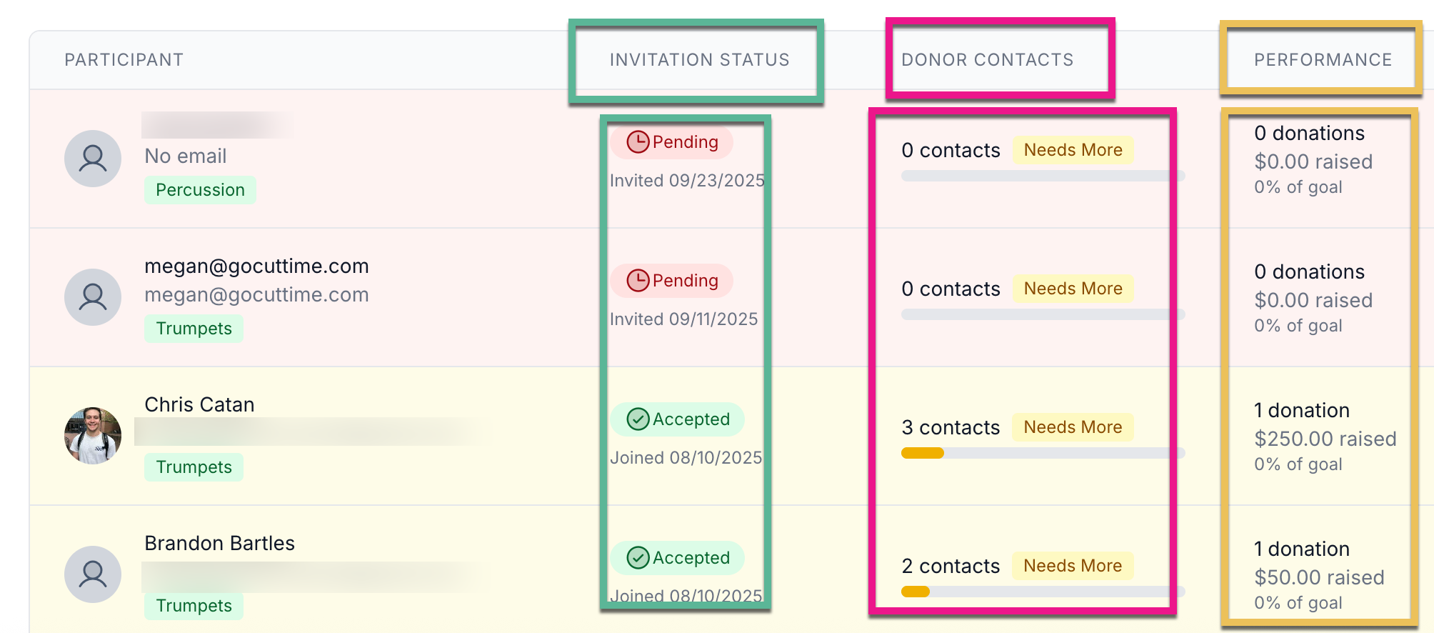 Go to either the Campaign's Goals & Participants Page, or the Participants Page to see more details about each of your Participants such as: