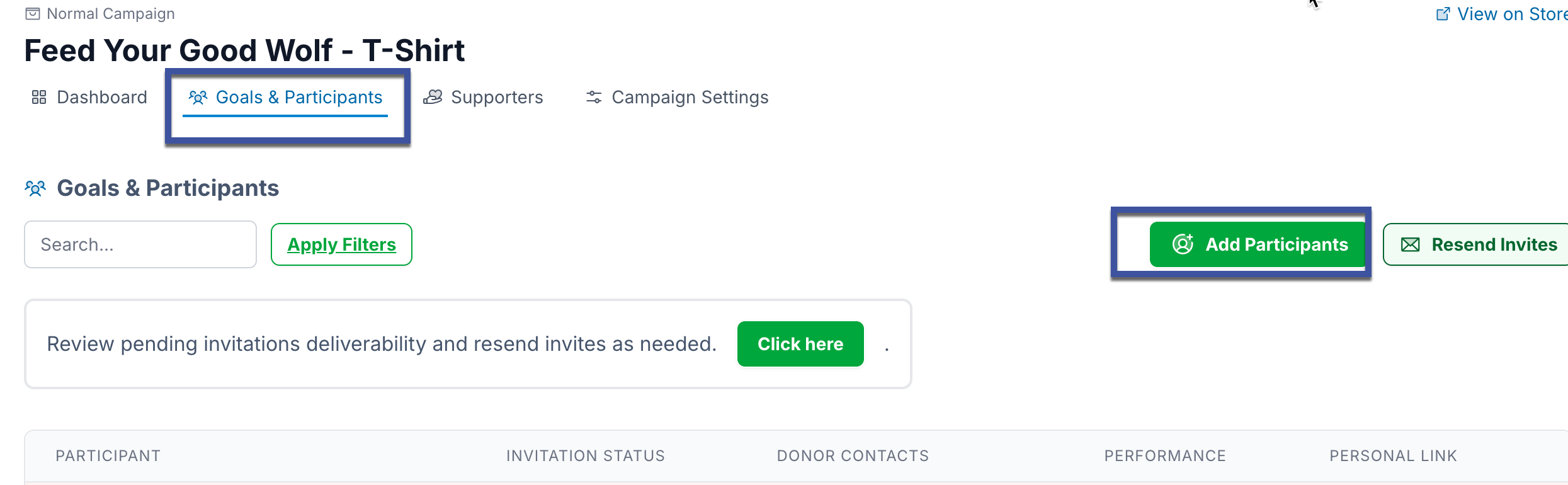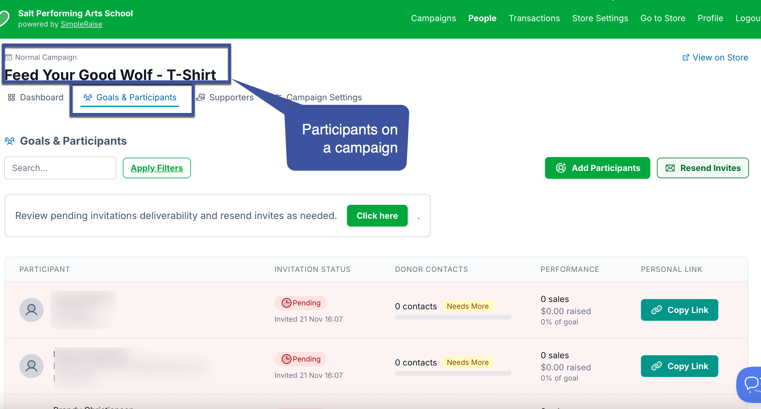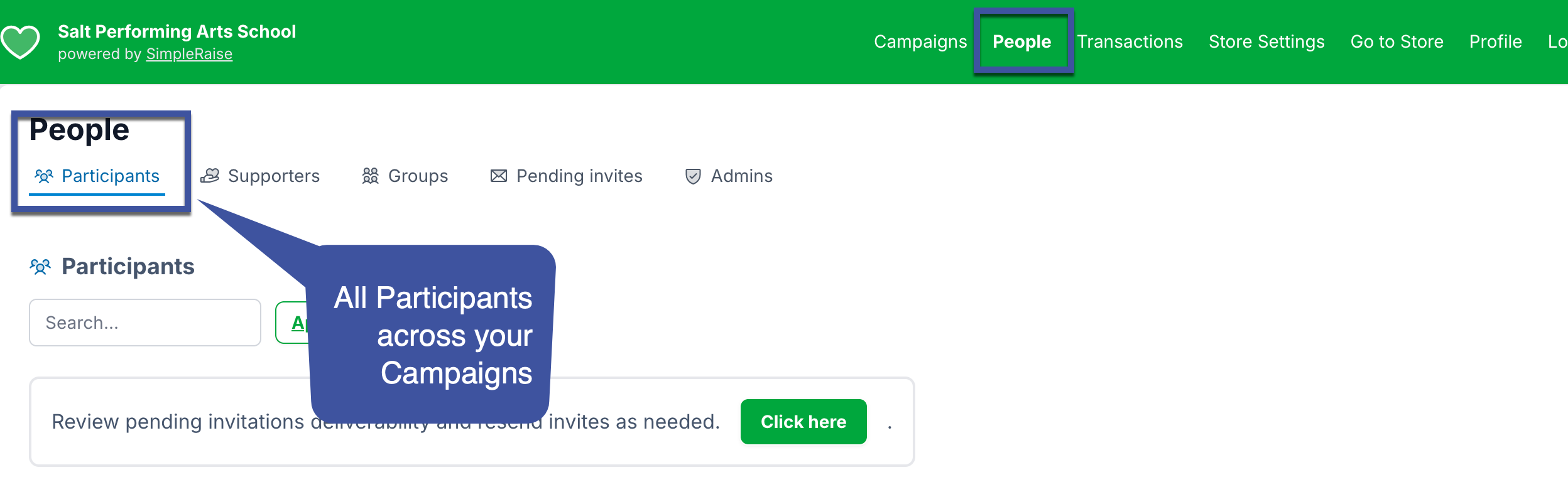 View all of your participant invitations for this Campaign under the Goals & Participants tab at the top of your Campaign Page, or by going to the People Page.