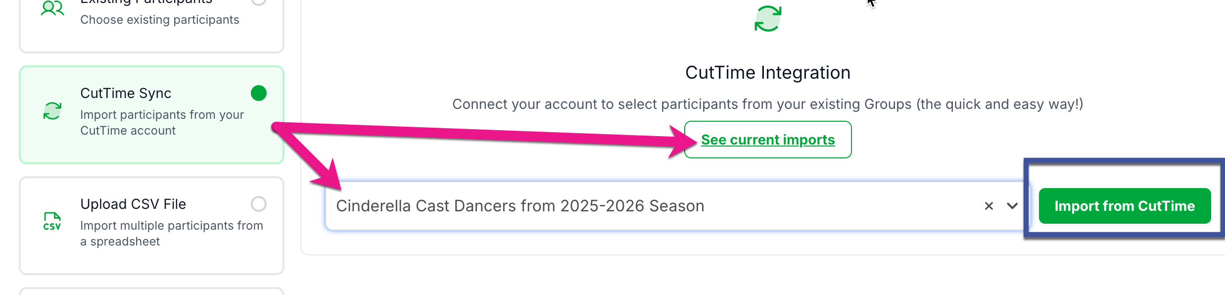 If you are a current CutTime customer and logged into Simple Raise with your CutTime user credentials, on the Invite Participants page, you will be able to sync rostered participants from your existing CutTime Group member data.