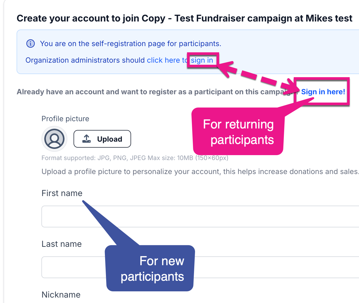 a. If the participant already has an account in Simple Raise for this program/organization, they can click the "Sign In" option.