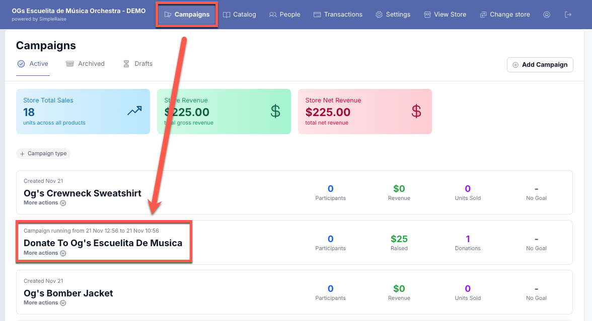 After logging into Simple Raise, go to the Campaigns page and select the specific fundraising campaign to which you wish to add participants to.
