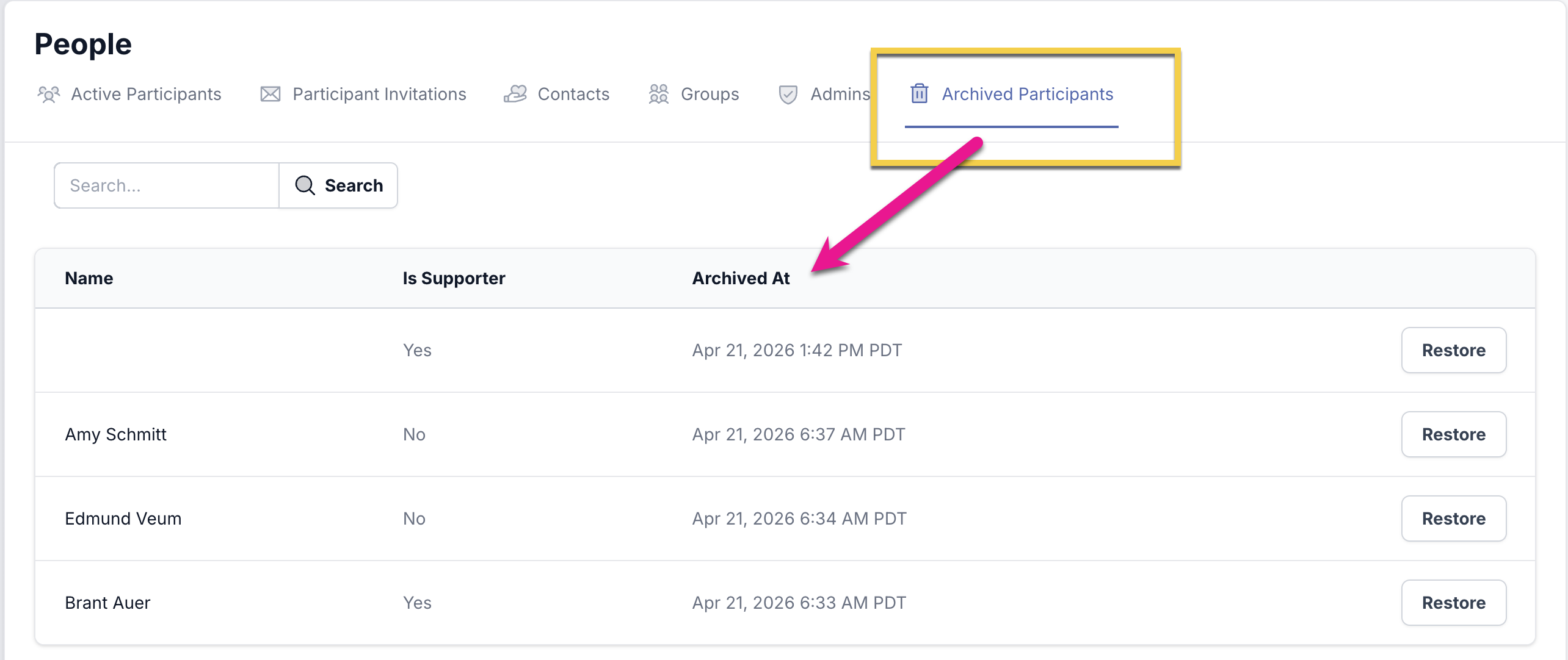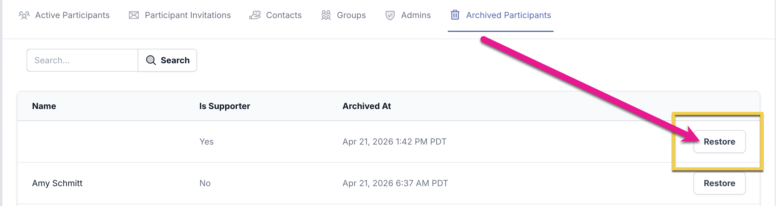 Should you need to restore a Supporter/Donor Contact to a Participant, you can click the "Restore" button.