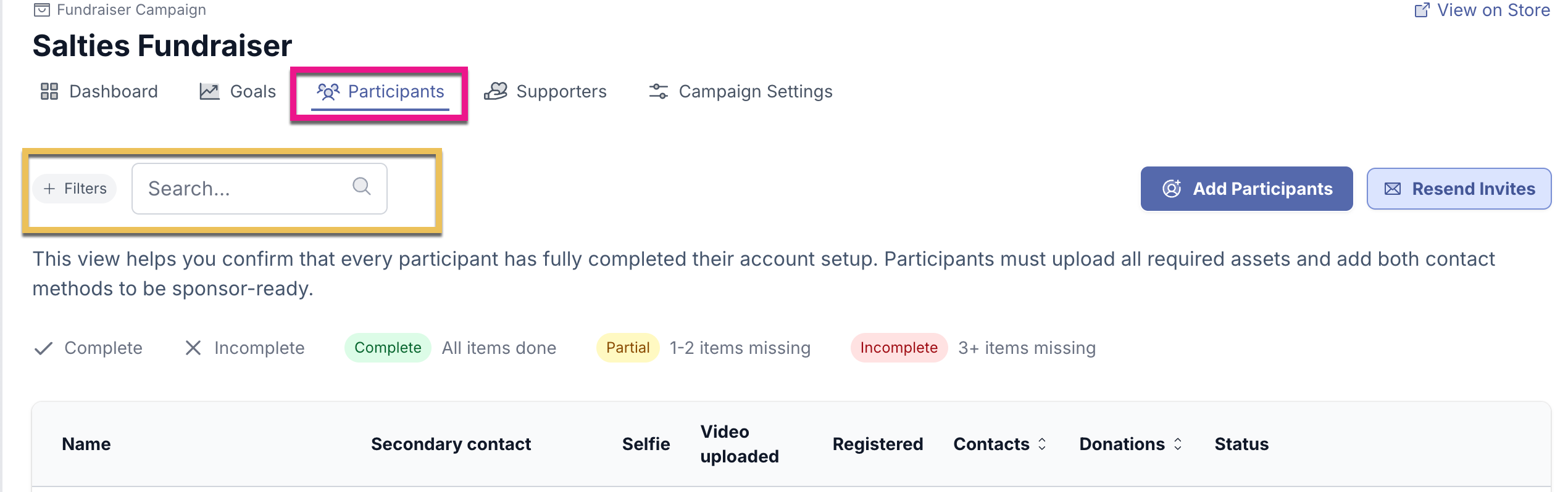 Participants are those students/members that are participating in your fundraising campaigns and raising funds through sending their personal links to potential donor contacts for them to donate to.