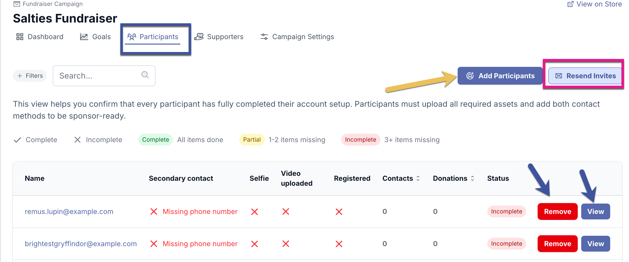 You can also Add Participants, Resend Unaccepted Invites, Delete Participants that need to be removed, and View your Campaign's Participant pages.