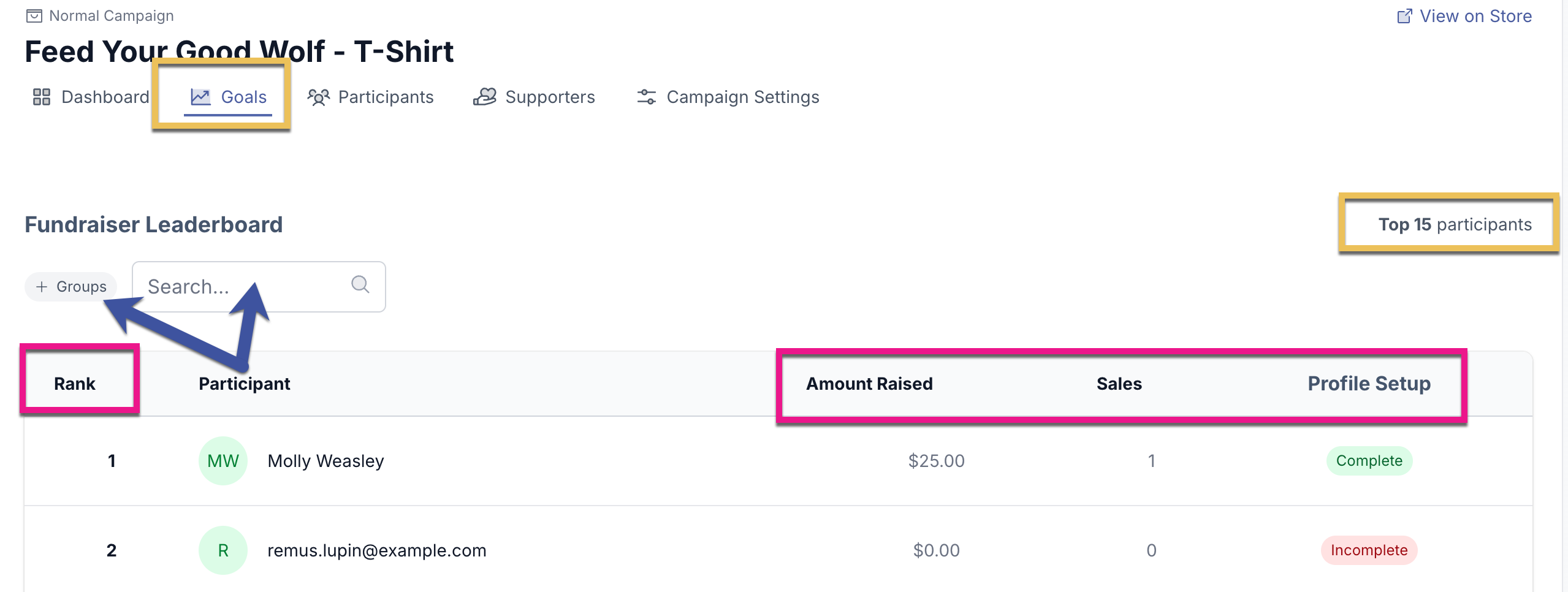 In the table, you will see the Rank, Name, Amount Raised, # of Sales, and if the Profile was Setup. You can also apply a Group filter or search by a participant's name.