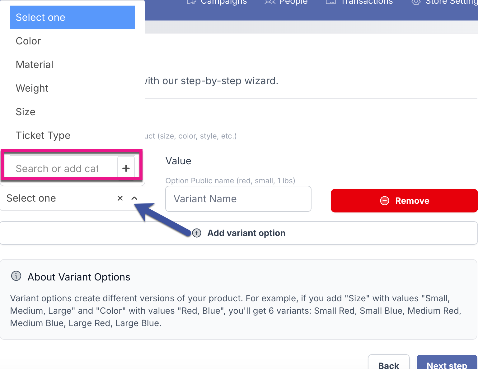 Multi-option products are items available in multiple variations. For example, a t-shirt may come in different sizes or colors, allowing customers to choose the option that best suits their preferences. On the Variant Options step in your product wizard setup, add as many applicable variants as you need.