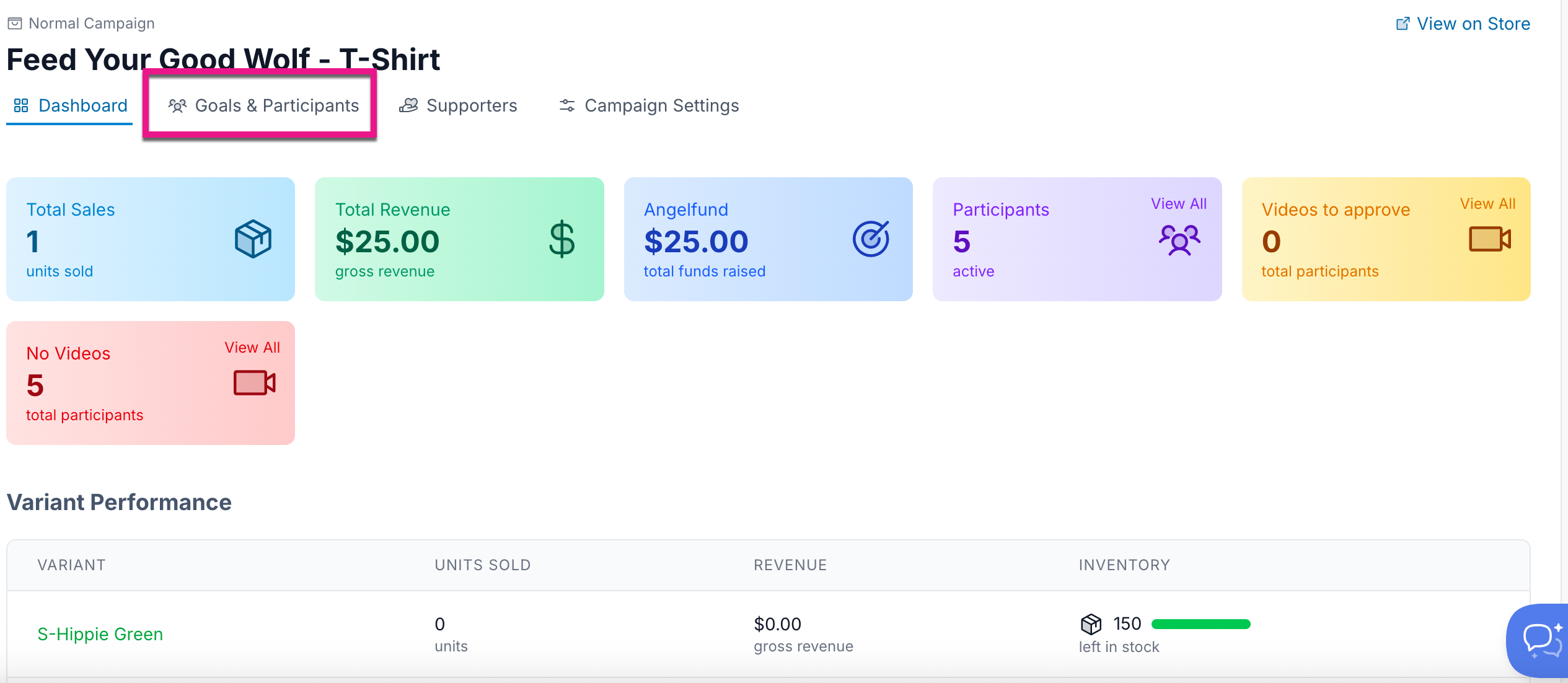 You set a specific financial goal for EACH of your fundraising participants. If you use this option, you can also split the goal between the individual Participant, and the Angel Fund (the organization's funding).