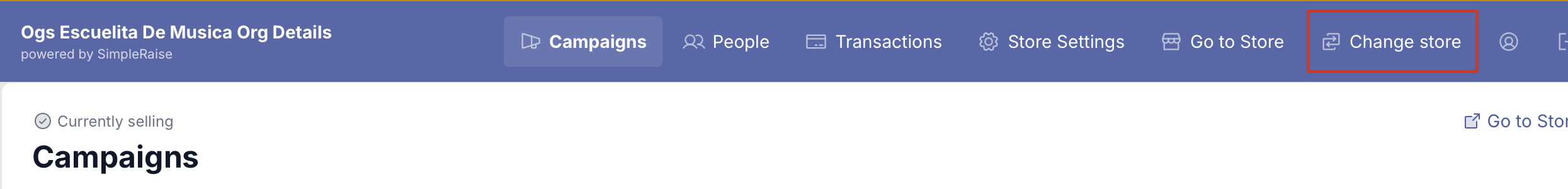 NOTE: If you are an admin on multiple Simple Raise Store Accounts, then you will see an additional option on your top navigation panel that says Change Store. This will allow you to switch between accounts in Simple Raise.