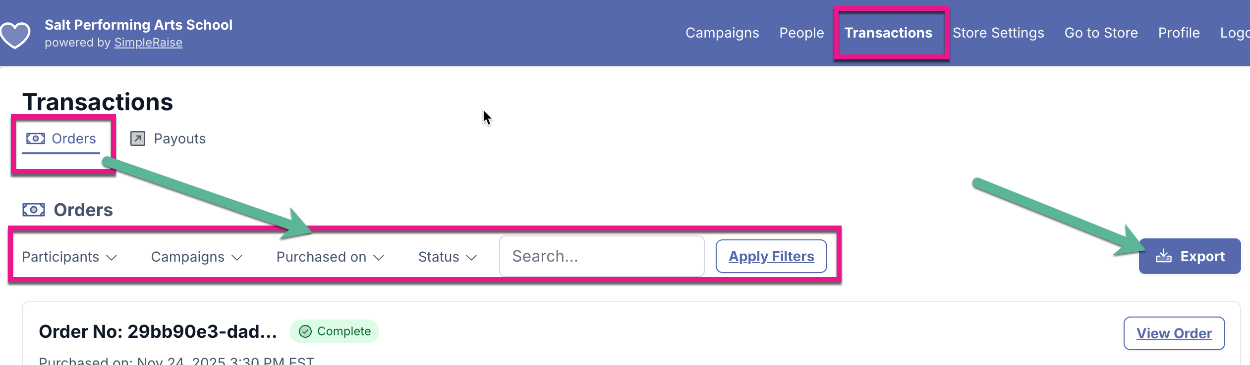 1) From the Store Dashboard, select the Transactions Page > Orders tab, and apply any filters needed such as Participant, Campaign, Purchased on, Status, email, phone, order #, etc.