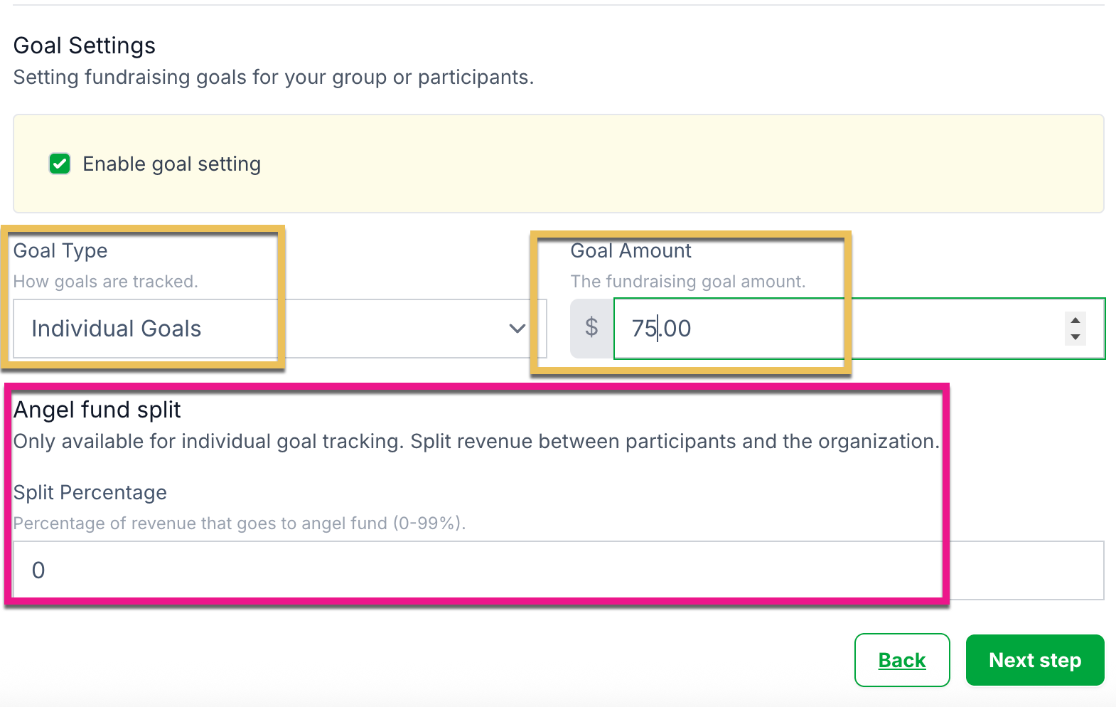 You set a specific financial goal for EACH of your fundraising participants. If you use this option, you can also split the goal between the individual Participant, and the Angel Fund (the organization's funding).