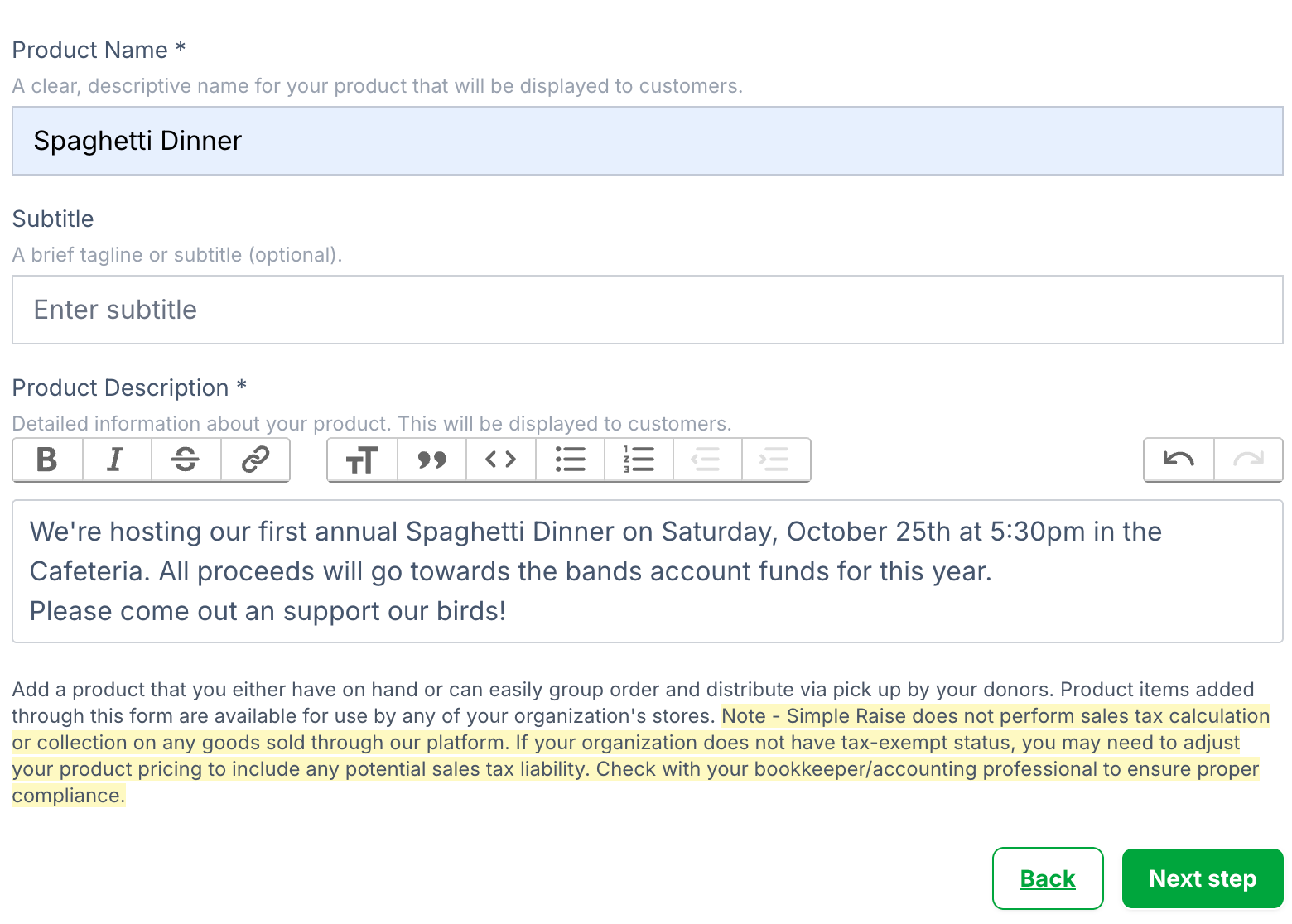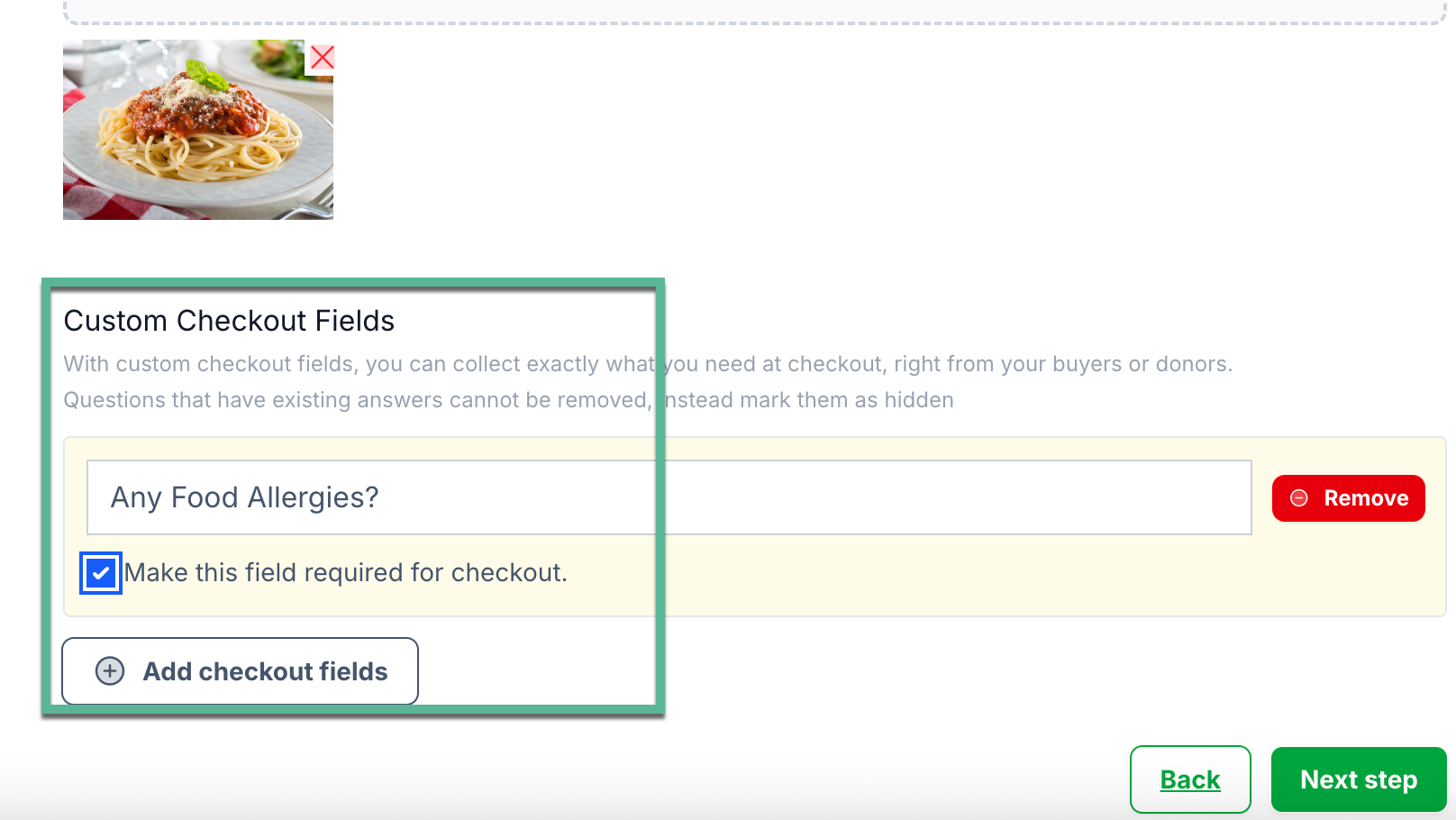 Should you need to collect information for this item's purchase - such as food allergies if you are hosting a dinner for example - you can make custom checkout fields. You can even make them required so they have to be filled out for customers to finalize their purchase on your store.