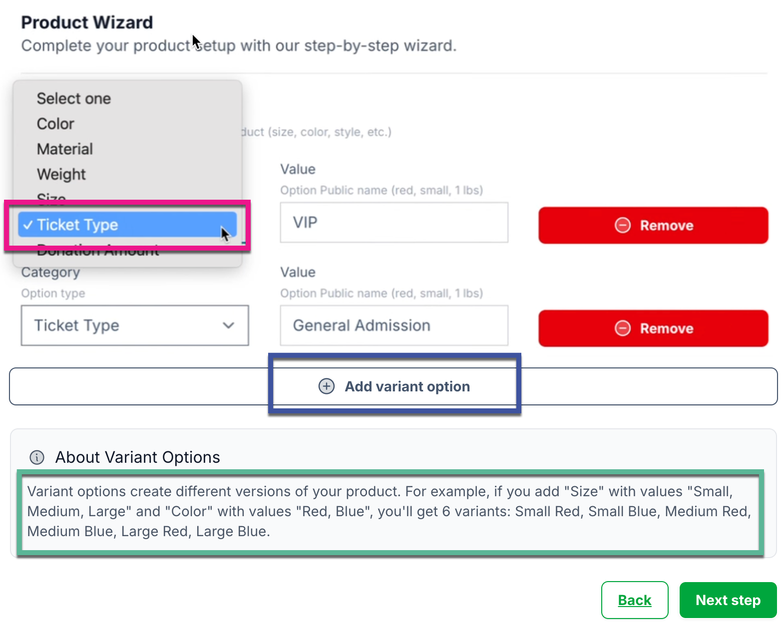 Multi-option events offer tickets in various forms, such as VIP and general admission, allowing customers to select the option that best suits their preferences. To create a product with multiple options, click "Add Variant Option”.