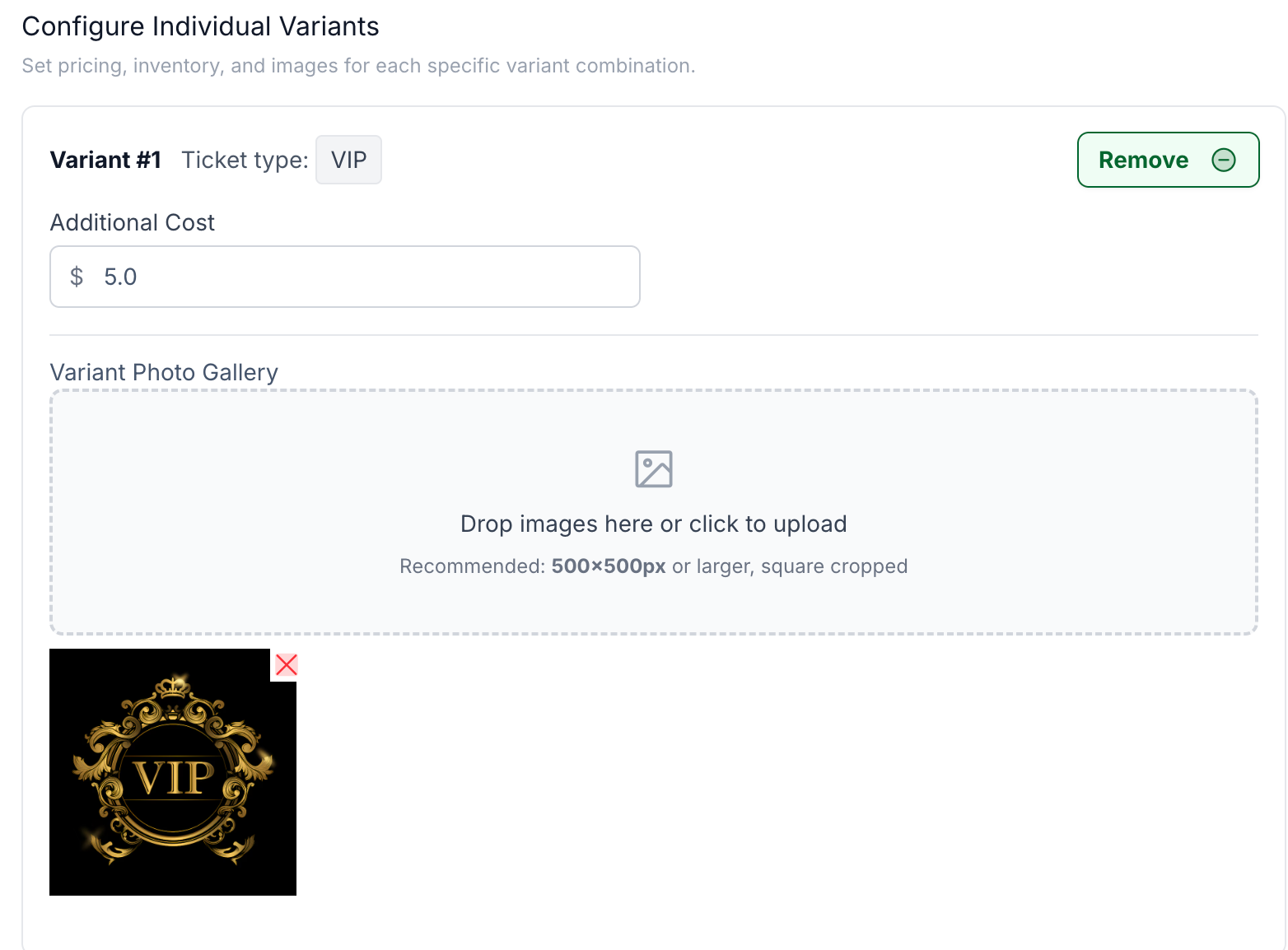 Upload an image for each variant, and if applicable, add any additional cost associated with the variant.