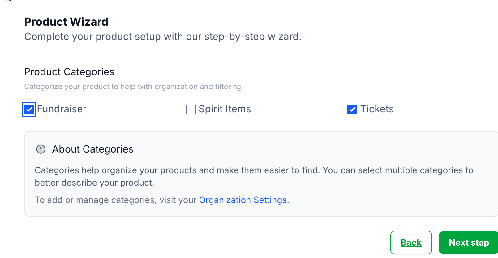 You can create as many categories as necessary, and you have the flexibility to add more categories at any time in the future. Simply click through on your Organization Settings page to make that adjustment. Then scroll down to the section that says "Product Categories" and add your new Category. You can also rearrange the order of the categories displayed on your Store.