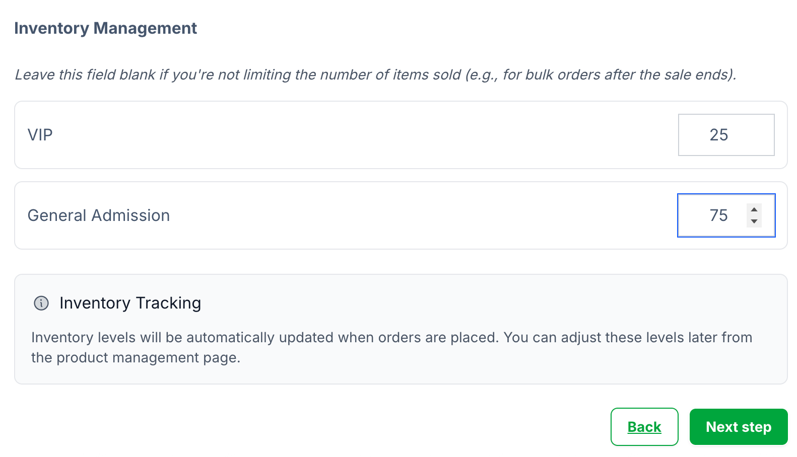 If you are not limiting the number of the product items that you are offering, then you can leave the boxes blank (for example, if you are planning on putting in a bulk order after the sale ends, you can use this option).
