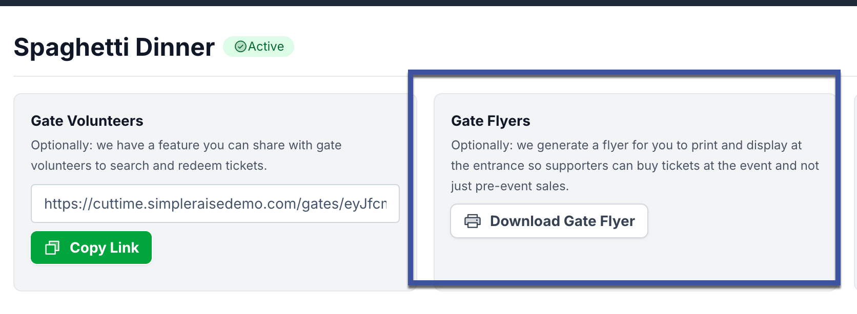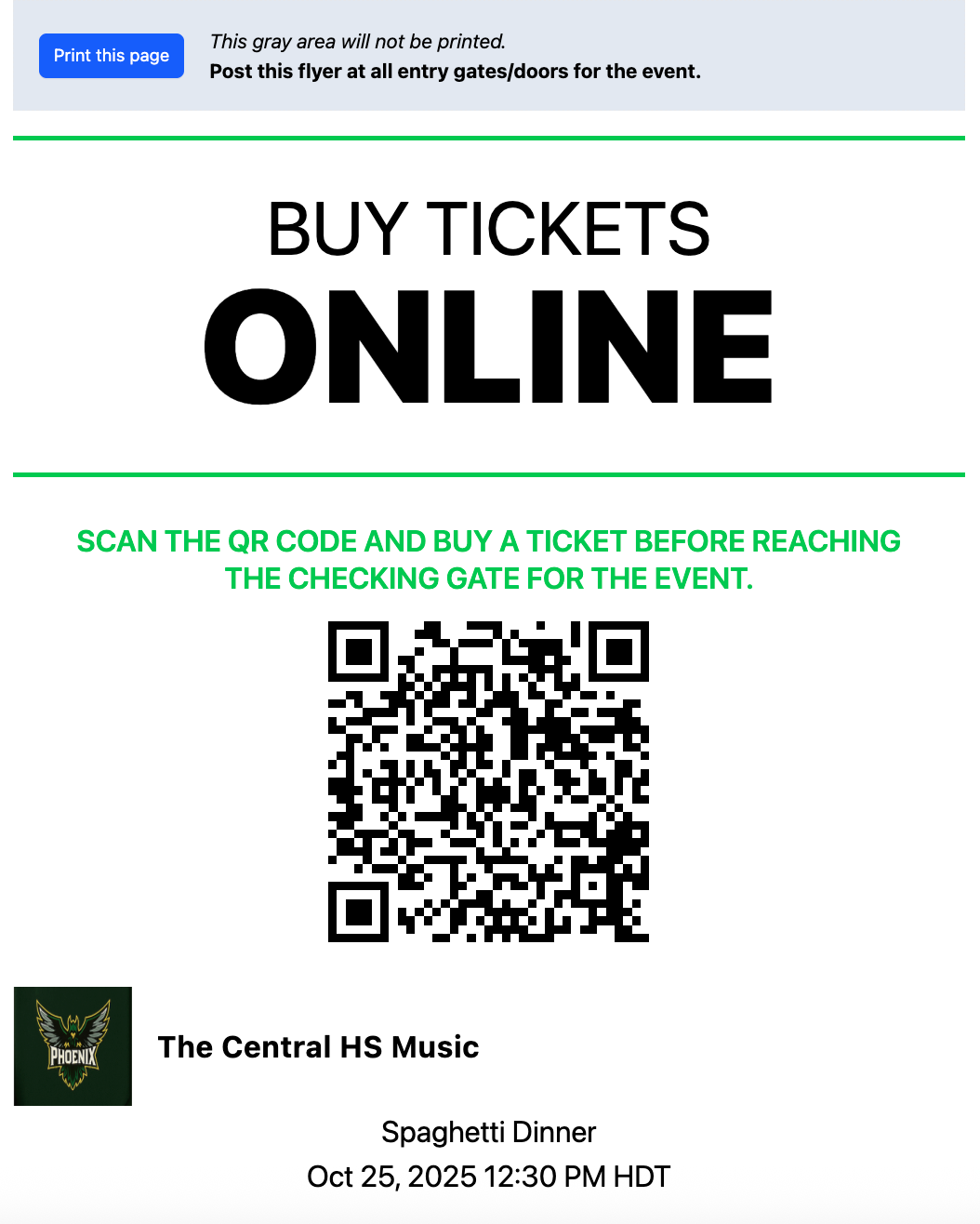 The gate flyer can be used during the event to facilitate ticket sales at the door. If you wish to offer tickets for purchase on-site, print the gate flyer and display it on the event day. Attendees can scan the QR code to conveniently purchase tickets.