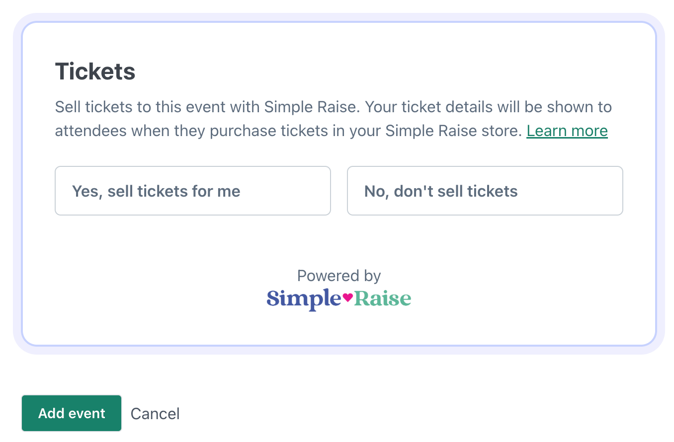 If this is your first event with automated ticket sales, a SimpleRaise store will be created for you, featuring the event you just created. Please note that all ticketed events created through CutTime will appear in your store.