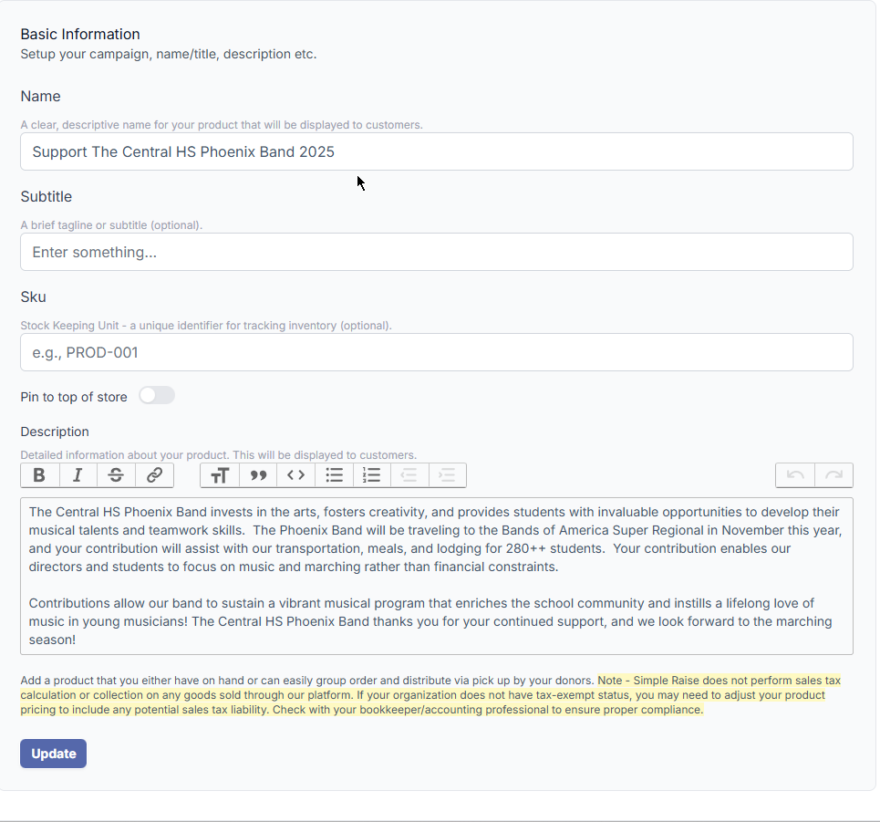 It should be noted that at this time, Simple Raise does not actually fulfill orders or carry inventory on behalf of customers. We only provide a platform to facilitate the purchase of items