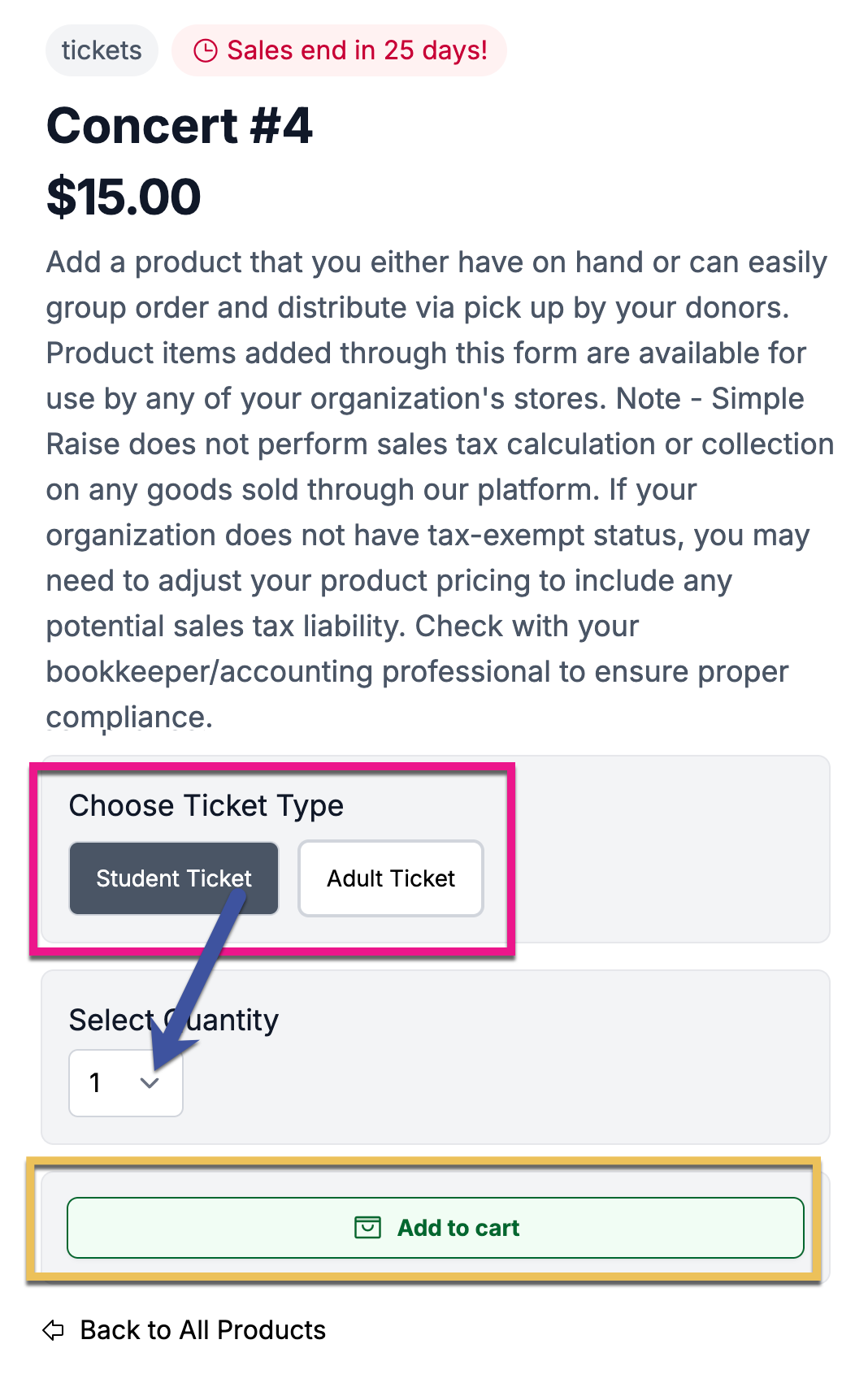 The shopper can select the number of tickets they wish to purchase and click 'Add to Cart.'